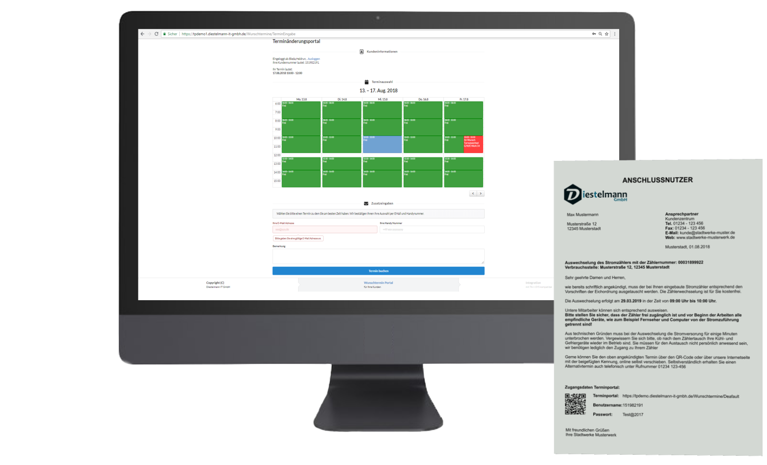 Mit dem Wunschterminkalender erhält der Kunde die Möglichkeit zur selbstständigen Terminverschiebung. Realisiert ist dies mittels eines WebServices und der dazugehörigen Internetseite im responsive Webdesign. Der Zugriff kann somit entweder durch ein Smartphone oder auch via WebBrowser geschehen. Um sich im Web-Portal zu identifizieren bedarf es einer Anmeldung. Diese ist im Kundenanschreiben via 2D-Barcode (z.B. QR-Code) zum Einscannen mit dem Smartphone enthalten. Nebst des besagten Barcodes sind auch Identifizierungsmerkmale im Klartext enthalten, sodass diese am heimischen Arbeitsplatz als Eingabewerte zur Anmeldung verwendet werden können.